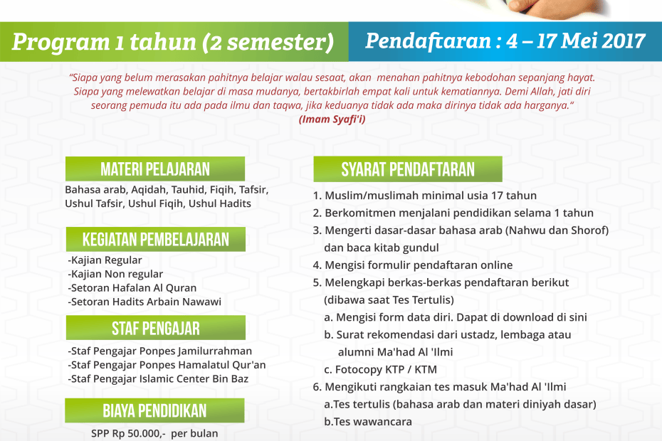 Segala puji hanyalah milik Allah subhanahu wa ta’ala. Shalawat serta salam semoga selalu tercurah kepada Rasulullah shalallahu… Read More »Pengumuman Hasil Seleksi Ma’had Al ‘Ilmi Angkatan XV Tahun Ajaran 1438/1439 H