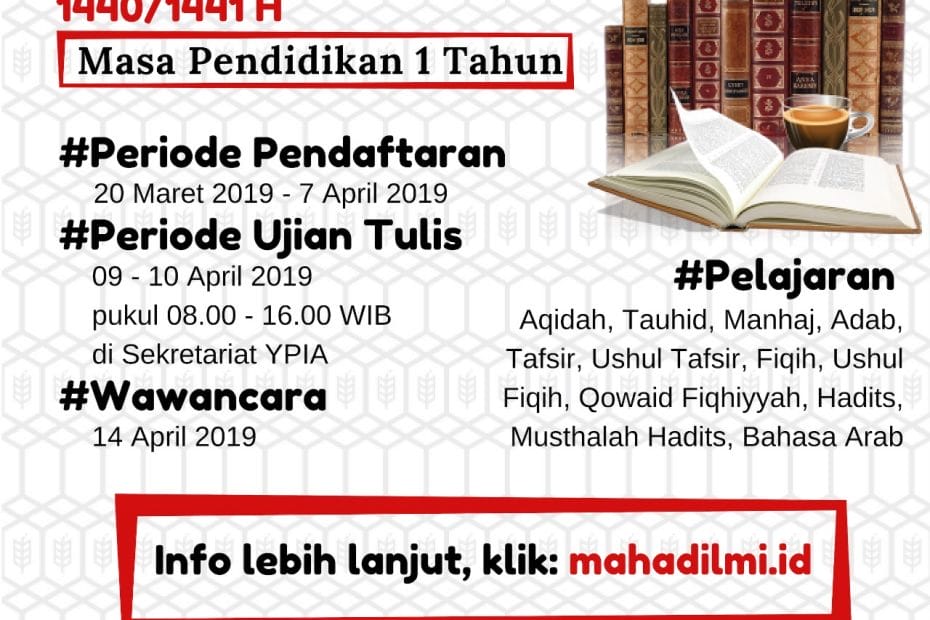 Tahun Ajaran 1440/1441 – 2019/2020 Program 1 tahun (2 semester) Terbuka untuk umum, mahasiswa –… Read More »Penerimaan Santri Baru Ma’had Al ‘Ilmi Yogyakarta