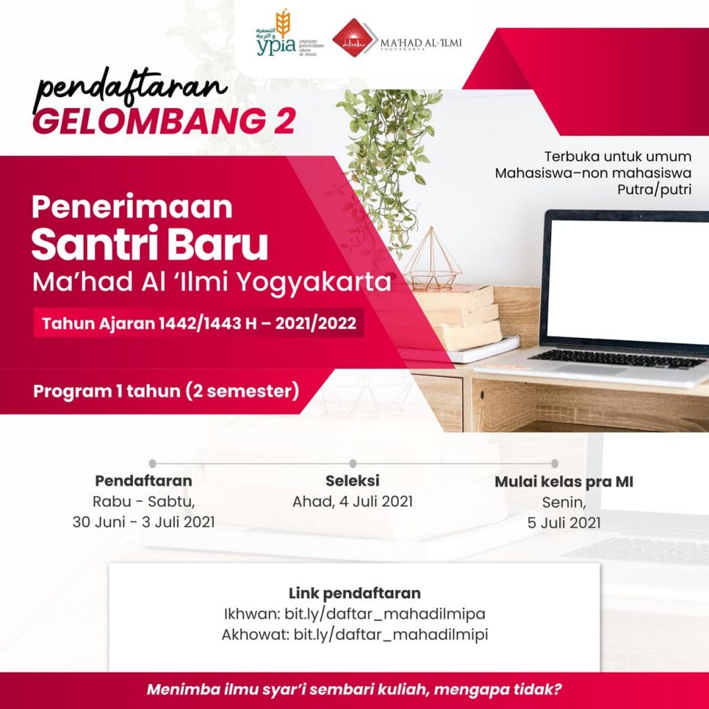Ma’had Al ‘Ilmi membuka pendaftaran gelombang 2 untuk yang belum berkesempatan untuk mendaftar di gelombang 1. Mari bergabung belajar bersama penuntut ilmu syar’i lainnya di Ma’had Al ‘Ilmi.