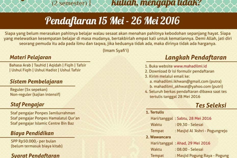 Penerimaan Santri Baru Ma’had Al-‘Ilmi Yogyakarta Angkatan XIII (Tahun Ajaran 1437/1438 – 2016/2017)